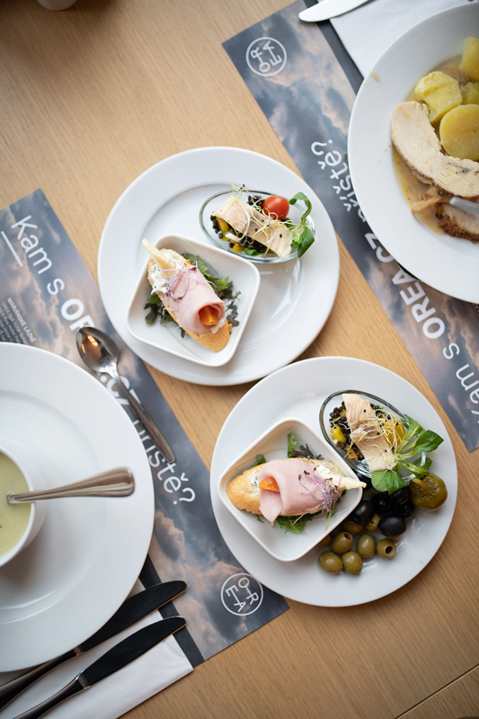 formou bufetu s výběrem předkrmů, hlavních chodů, příloh, dezertů a salátů; nápoje za poplatek