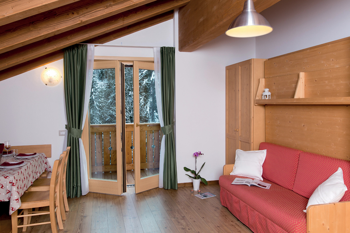 33 až 44 m² - obývací pokoj s kuchyňským koutem, skříňovou manželskou postelí a palandou či 2 samostatnými lůžky (u některých apartmánů v částečně oddělené místnosti), sociální zařízení