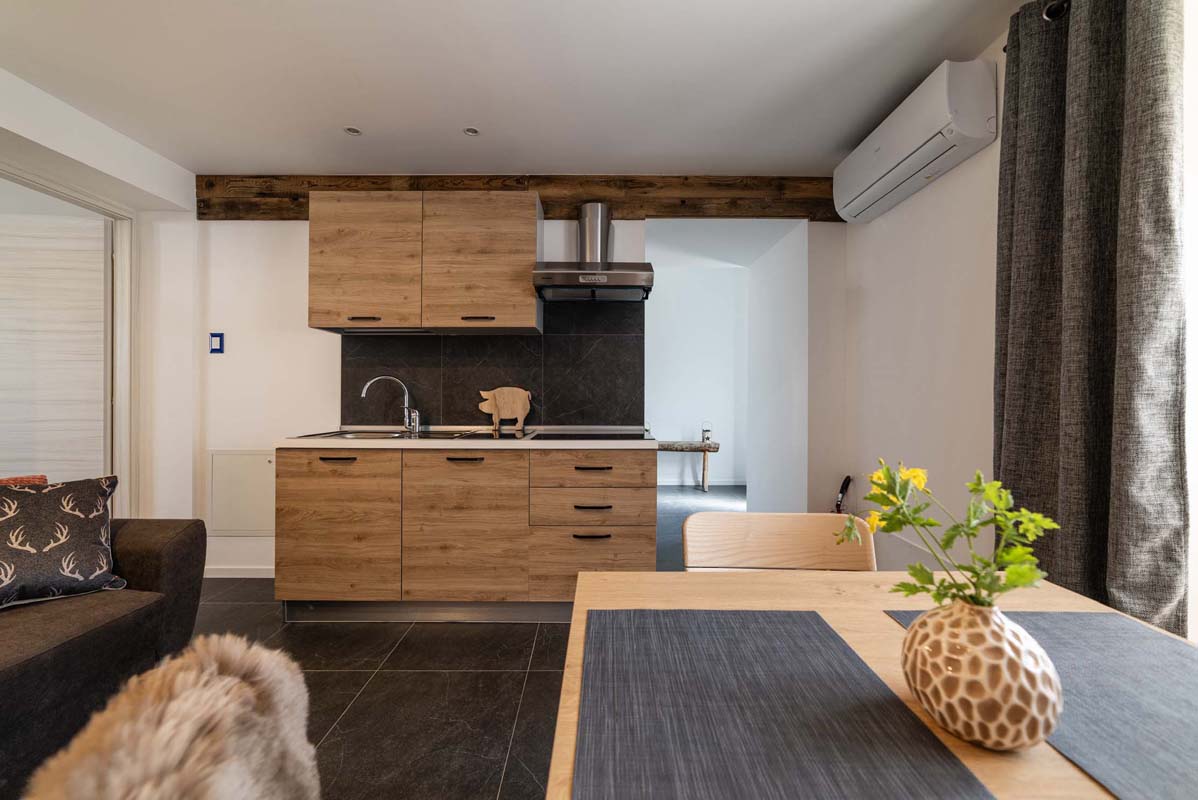 62 m² - 1 ložnice a manželskou postelí a částečně odděleným samostatným lůžkem, 1 ložnice s 1 samostatným lůžkem, obývací pokoj s kuchyňským koutem a rozkládacím gaučem pro 2 osoby (160x 200),2x sociální zařízení se sprchovým koutem typu walk-in; apartmán se nachází v přízemí