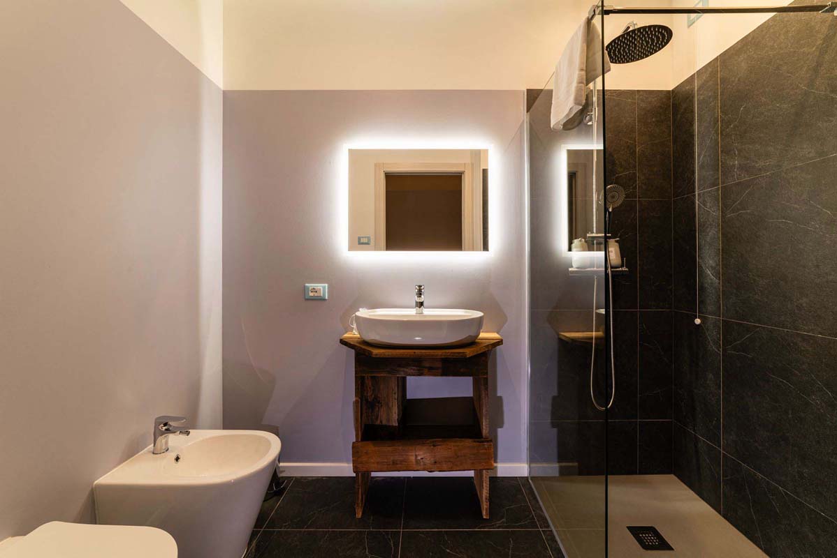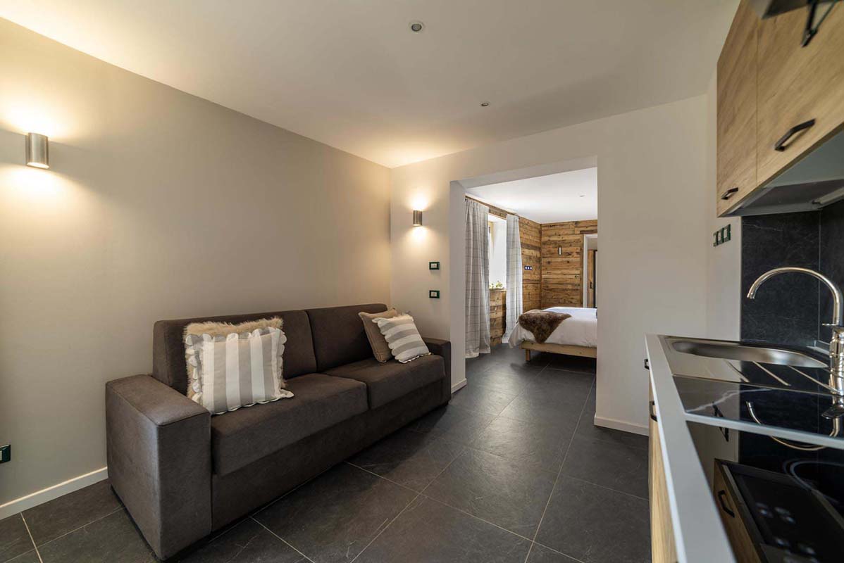 49 m² - 1 ložnice s manželskou postelí a částečně odděleným samostatným lůžkem, obývací pokoj s kuchyňským koutem a rozkládacím gaučem pro 2 osoby (160x200), v rámci neuzavřeného vyvýšeného patra malá ložnice s manželskou postelí, sociální zařízení se sprchovým koutem typu walk-in, 2x balkon; apartmán se nachází ve druhém patře; v apartmánu není možný pobyt se psem