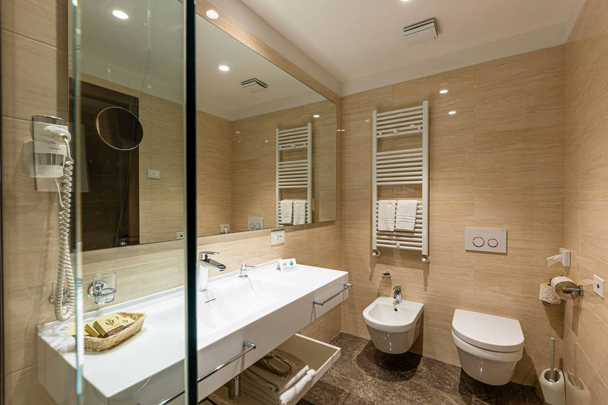 TV sat., klimatizace, telefon, trezor, fén, nápojová lednička a vraná konvice (pouze typologie Junior Suite 2/3/4), wi-fi připojení k internetu