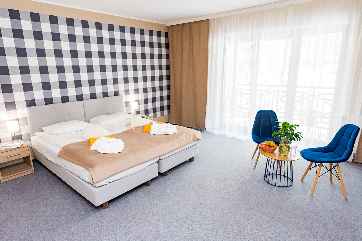 25-30 m² – pokoj se 2 samostatnými lůžky, rozkládacím gaučem pro 2 osoby, sociální zařízení se sprchou, balkon