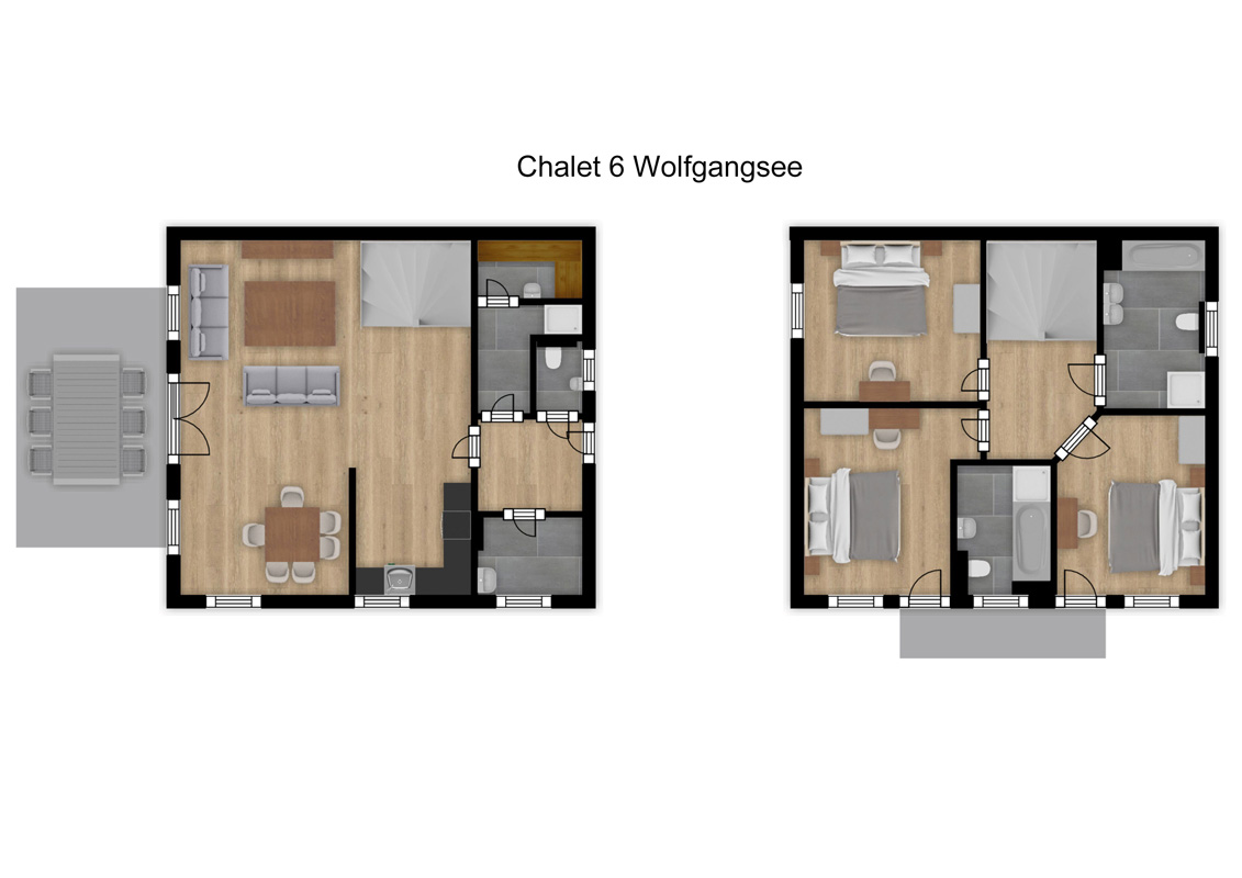 110 m² - 1. podlaží chaletu: obývací pokoj s kuchyňským a jídelním koutem, gauč, samostatné WC, privátní sauna se sprchou, terasa; 2. podlaží chaletu: 3 ložnice s manželskou postelí či 2 samostatnými lůžky, 2x sociální zařízení se sprchou, balkon (společný pro 2 ložnice)