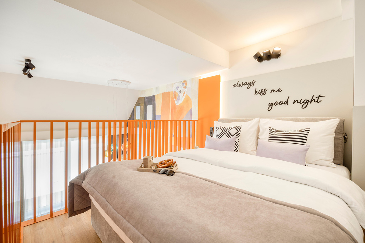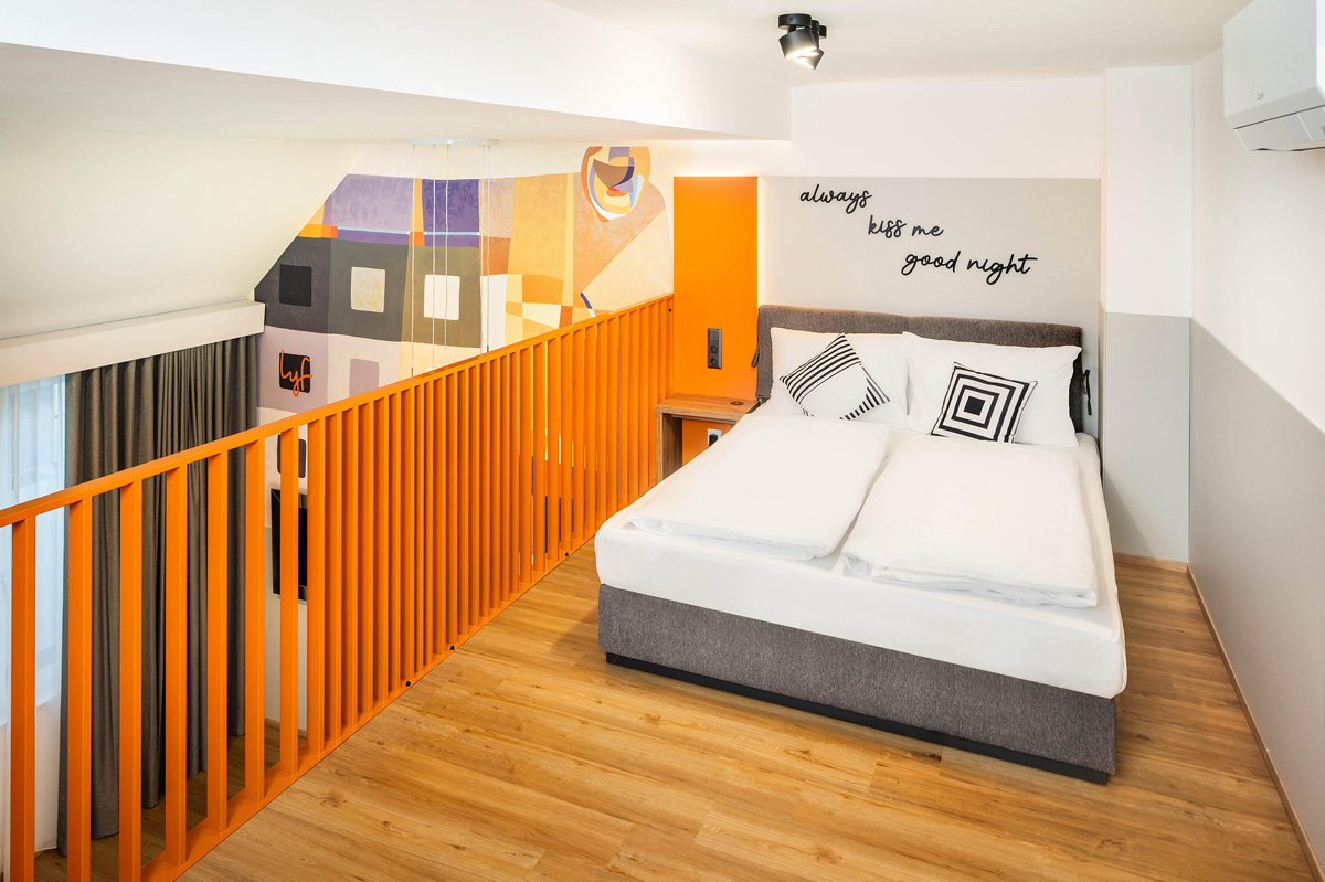 22 m² - ložnice s manželskou postelí, obývací pokoj s posezením a kuchyňským koutem, sociální zařízení se sprchou; zpravidla dvoupatrový pokoj s ložnicí v horní části přístupné po schodech