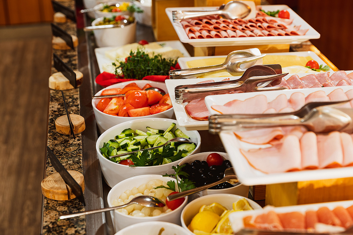 fakultativně za poplatek - formou mezinárodního bufetu v hotelové restauraci; nápoje za poplatek (nutné předem objednat)