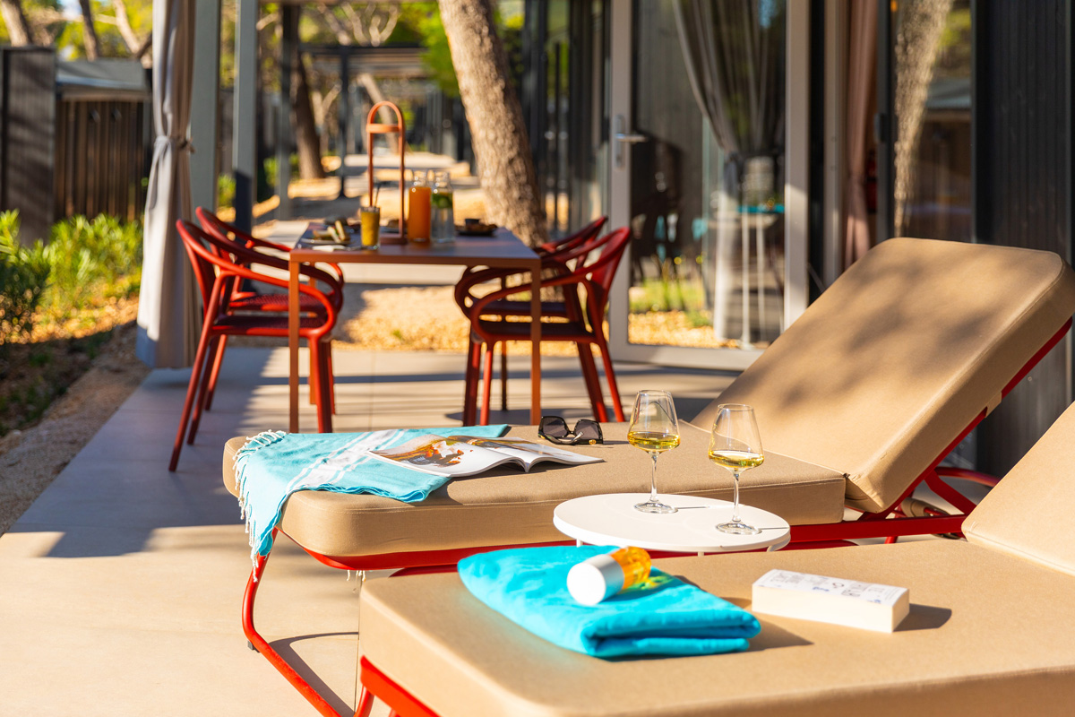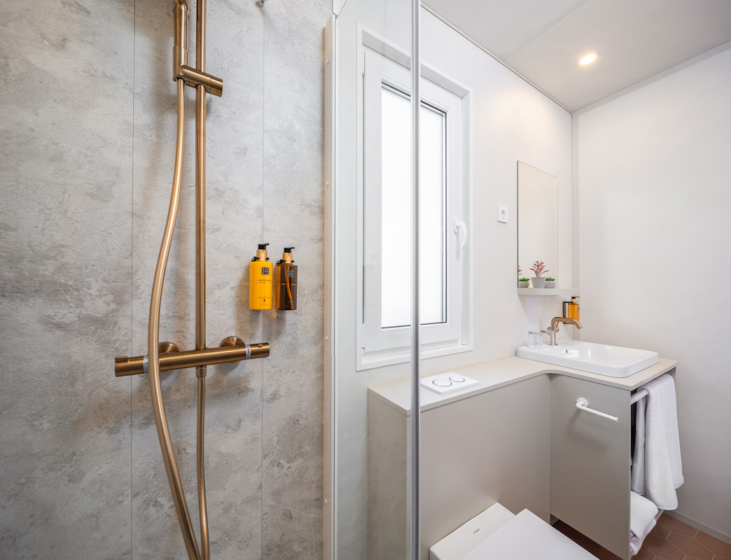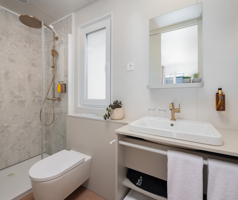 Premium Mobile home 4+1 - 32 m²- pokoj s manželskou postelí, druhý pokoj s oddělenými lůžky, obývací místnost s přistýlkou vhodnou pro dítě do nedovršených 12 let, plně vybaveným kuchyňským koutem a jídelním stolem, dvě sociální zařízení sprchou, zastřešená terasa s posezením a lehátky