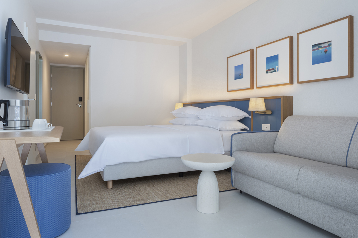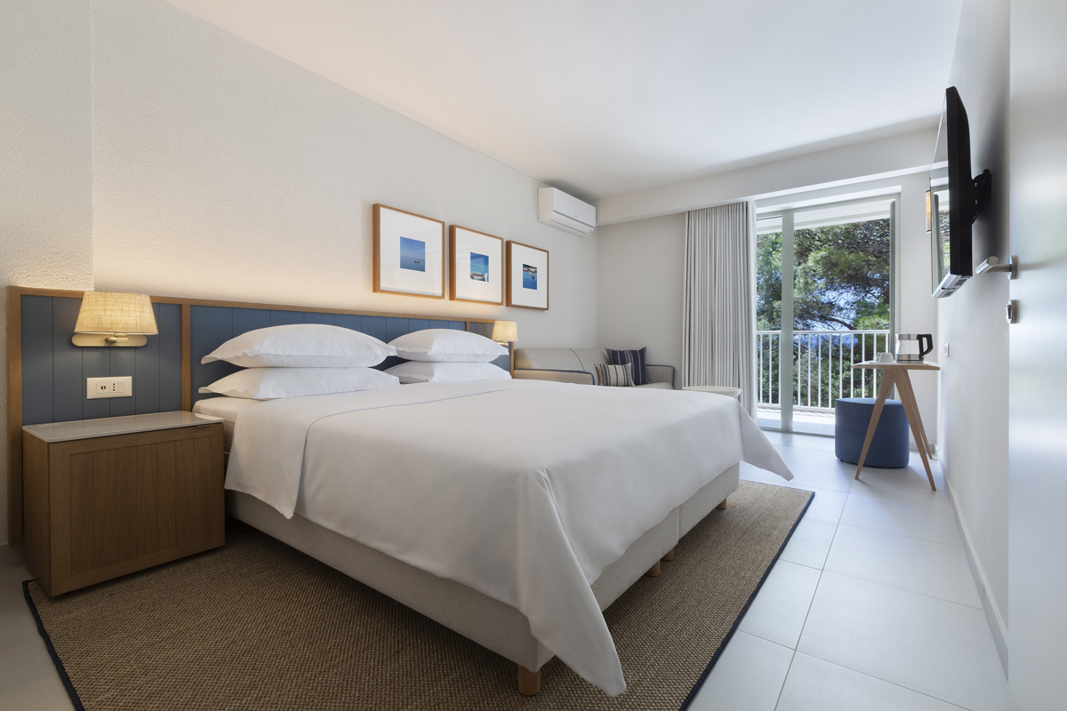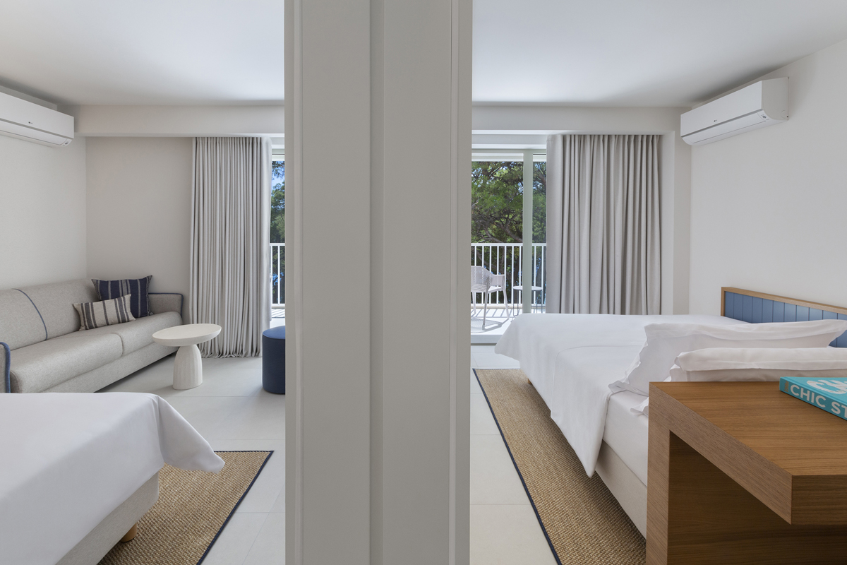 Superior 2+2 balkon M - 20 m² - pokoj s manželskou postelí s možností přistýlky formou rozkládacího gauče vhodnou pro jednu dospělou osobu a jedno dítě do nedovršených 14 let nebo pro dvě děti do nedovršených 14 let, sociální zařízení se sprchou, balkon orientován k moři
