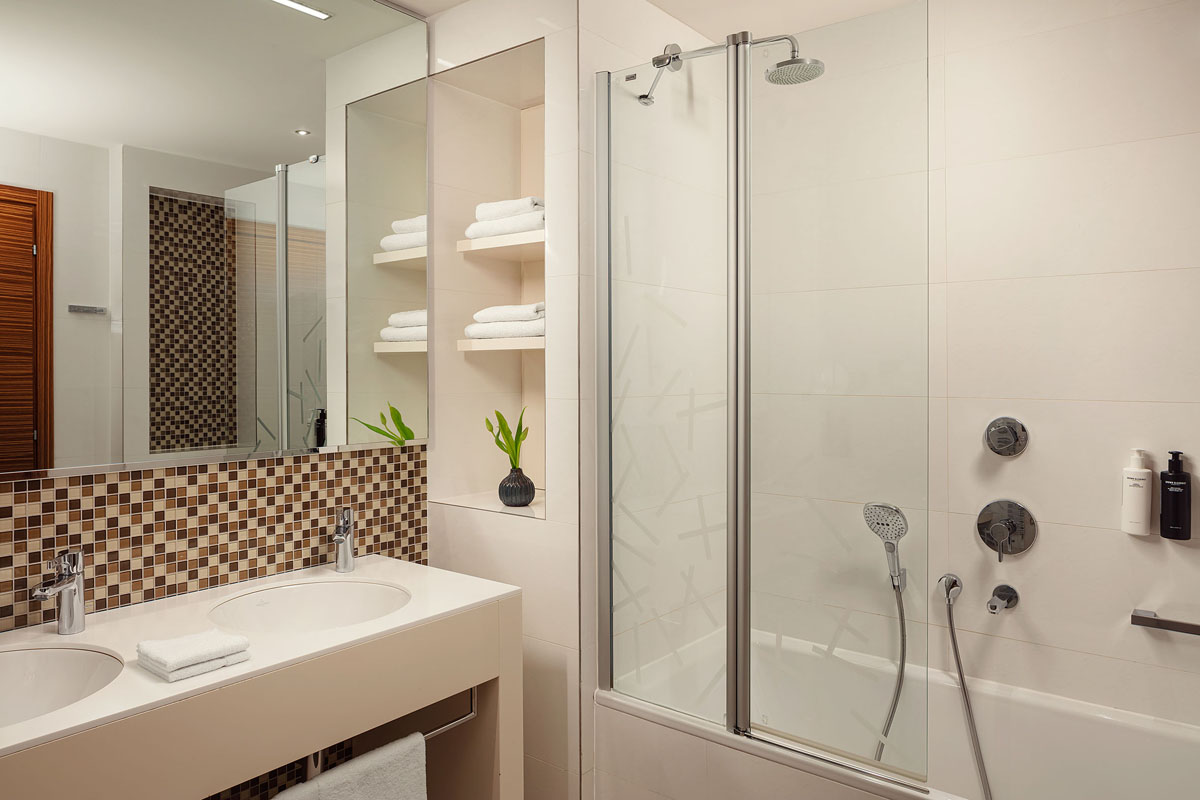 25 m², pokoj s manželskou postelí, sociální zařízení se sprchou či vanou, pohled na atrium