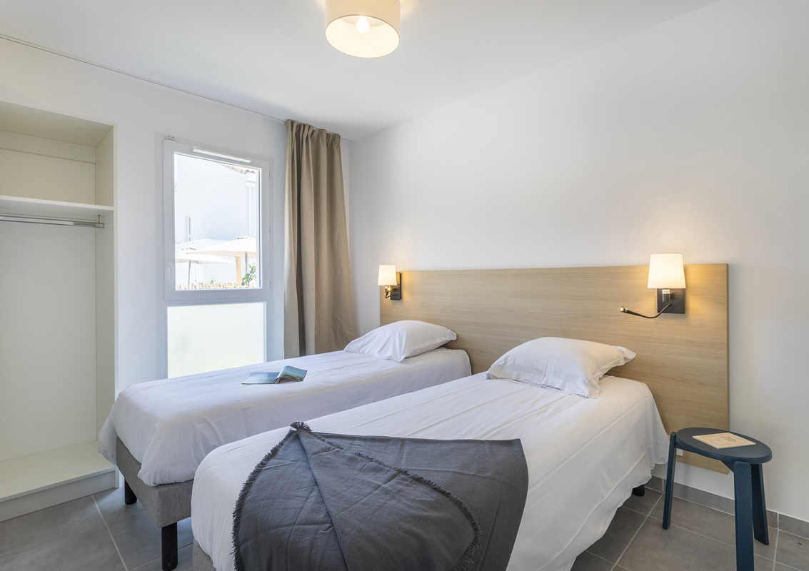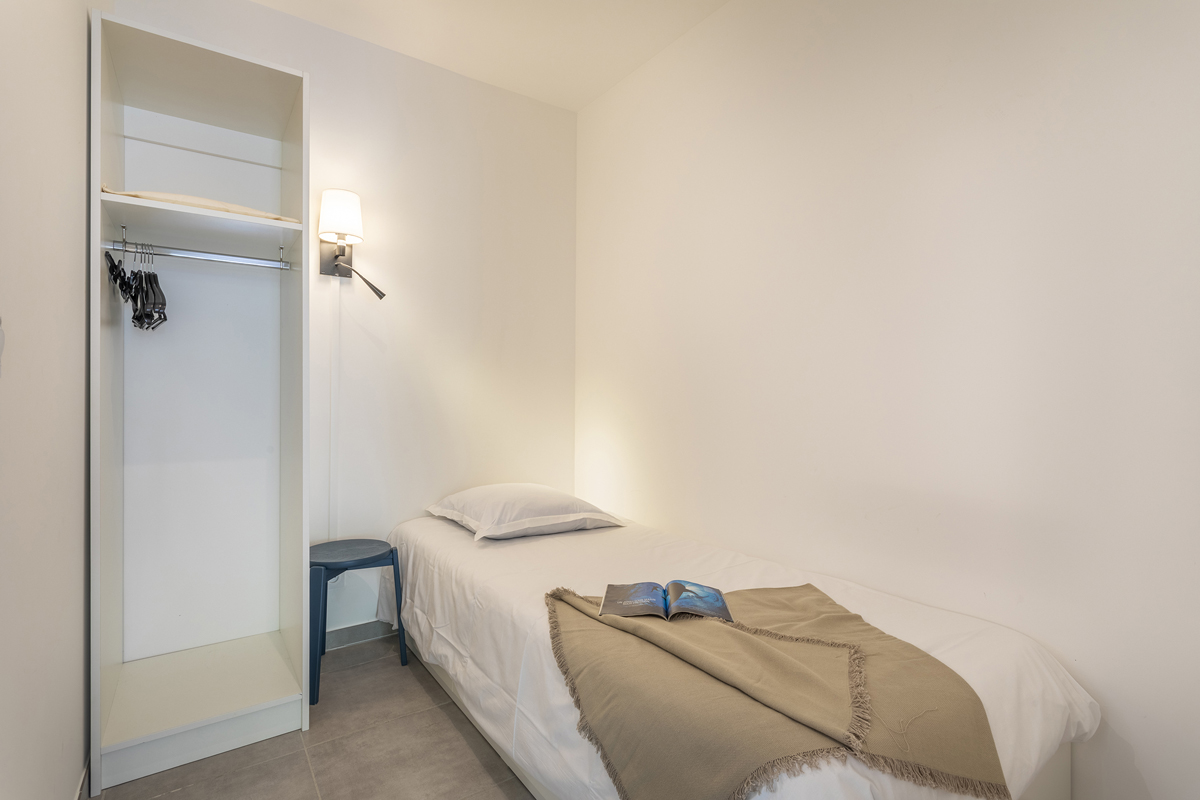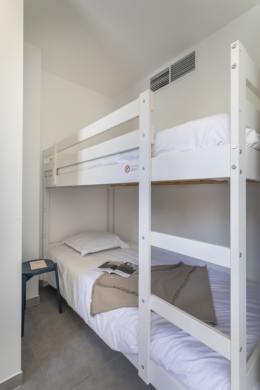 studio 4 - 25 m² - 1 kabina se 2 samostatnými lůžky (možno spojit), obývací pokoj s kuchyňským koutem a rozkládacím gaučem pro 2 osoby (možno i typ "šuplík"), sociální zařízení se sprchou, balkon či terasa
