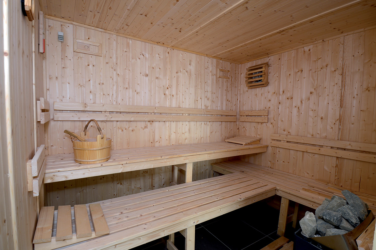 venkovní bazén 24 x 8 m s dětským bazénkem a s lehátky, menší posilovna, sauna*, pára*