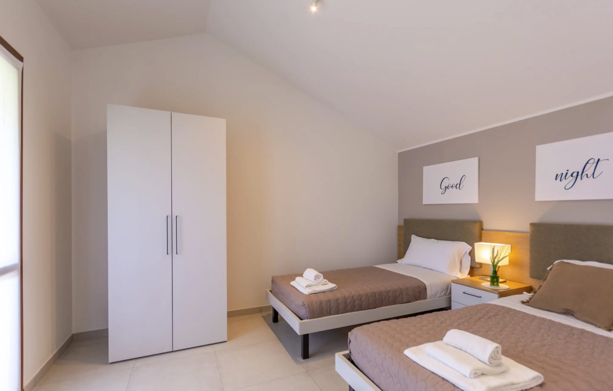 quadri 6 V4P bazén - 100 m² – polovina jednopatrové vily; přízemí 1 ložnice s manželskou postelí, obývací pokoj s kuchyňským koutem, sociální zařízení se sprchou, veranda s venkovním krbem s grilem, zahrada se soukromým bazénem; v patře 1 ložnice s manželskou postelí, 1 ložnice se 2 samostatnými lůžky nebo palandou, sociální zařízení se sprchou; 2 parkovací místa u domu; na vyžádání možnost 7. osoby na přistýlce*