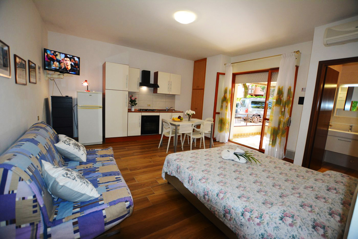 obývací pokoj s kuchyňským koutem, 1 manželskou postelí či 1 samostatným sklápěcím lůžkem a rozkládacím gaučem pro 2 osoby, sociální zařízení se sprchovým koutem, terasa