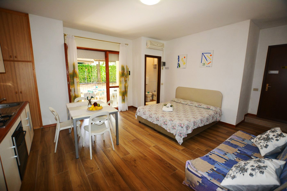 1 ložnice s manželskou postelí, obývací pokoj s kuchyňským koutem a rozkládacím gaučem pro 2 osoby, sociální zařízení se sprchou, terasa