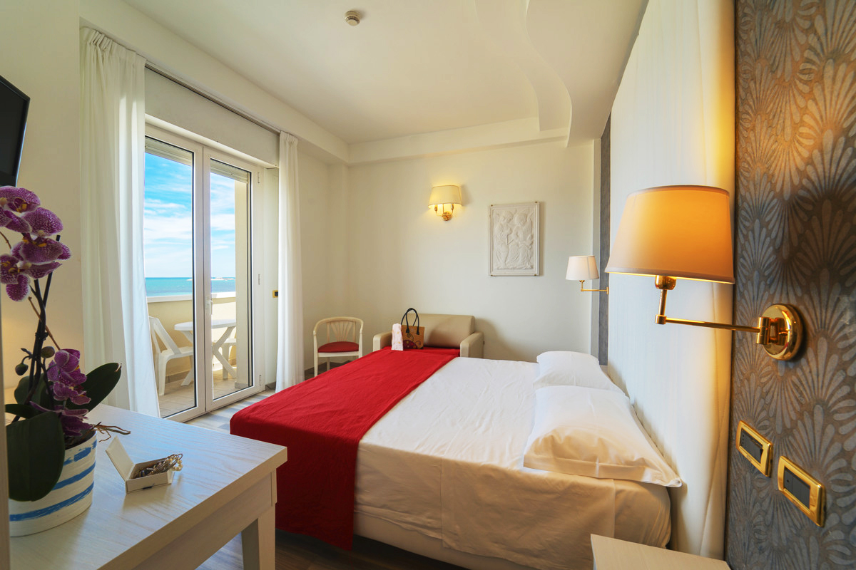 Comfort 2 - pokoj s manželskou postelí či 2 samostatnými lůžky, sociální zařízení se sprchou, balkon s přímým výhledem na moře