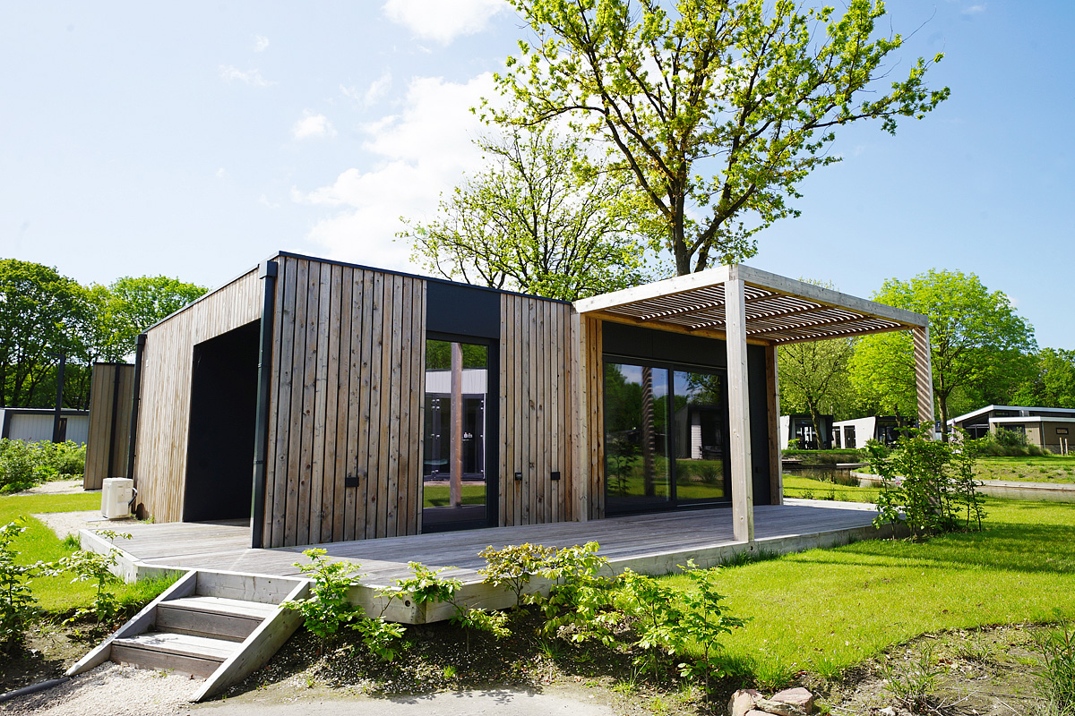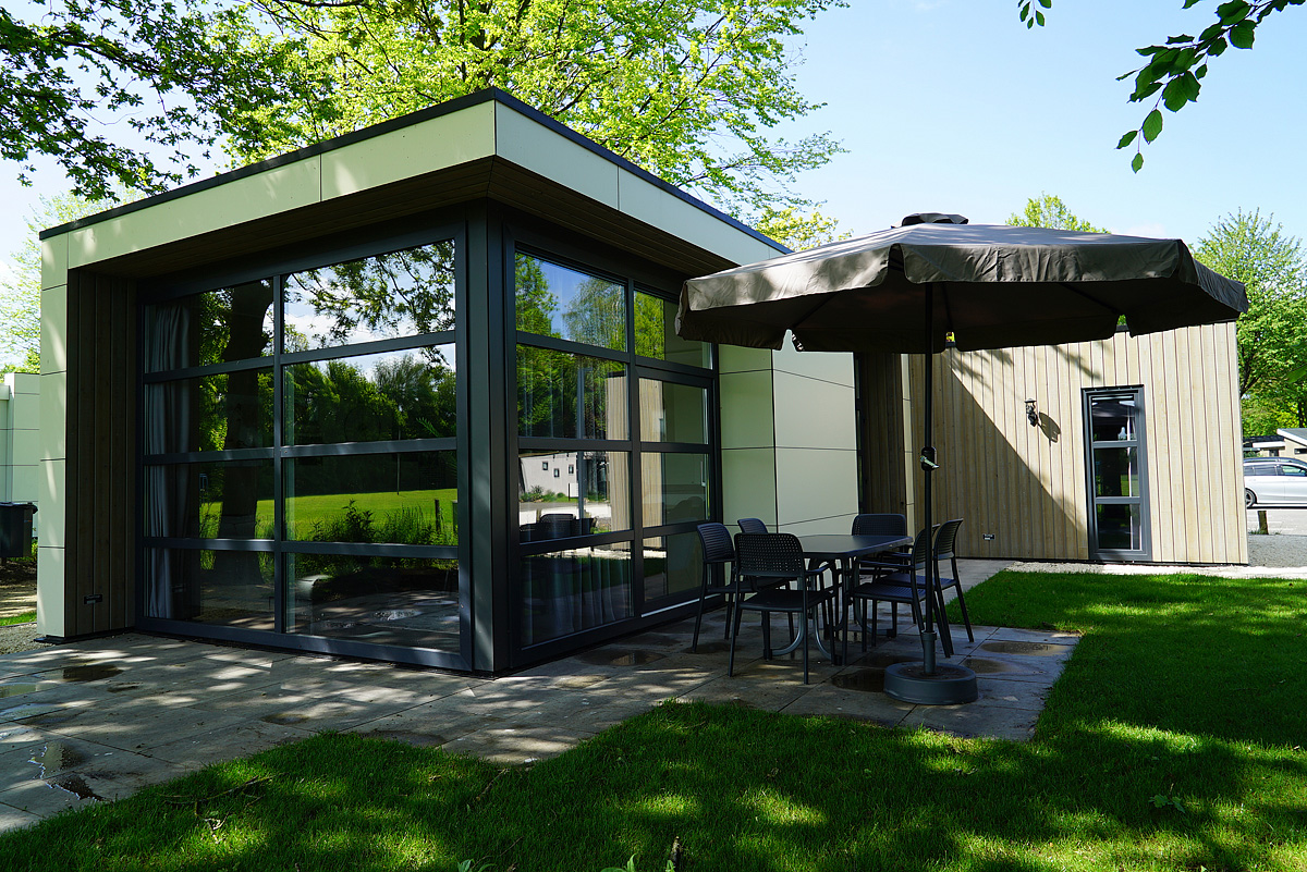 dvoupatrový chalet, přízemí: 1 ložnice se 2 samostatnými lůžky, obývací pokoj s kuchyňským koutem, sociální zařízení, toaleta samostatně, 1. patro: 1 ložnice se 2 samostatnými lůžky, 2 ložnice s palandou pro až 4 děti do 15 let, sociální zařízení, venkovní terasa se zahradním nábytkem, další venkovní terasa v patře, max. obsazenost pro 4 dospělé osoby a 4 děti do 15 let