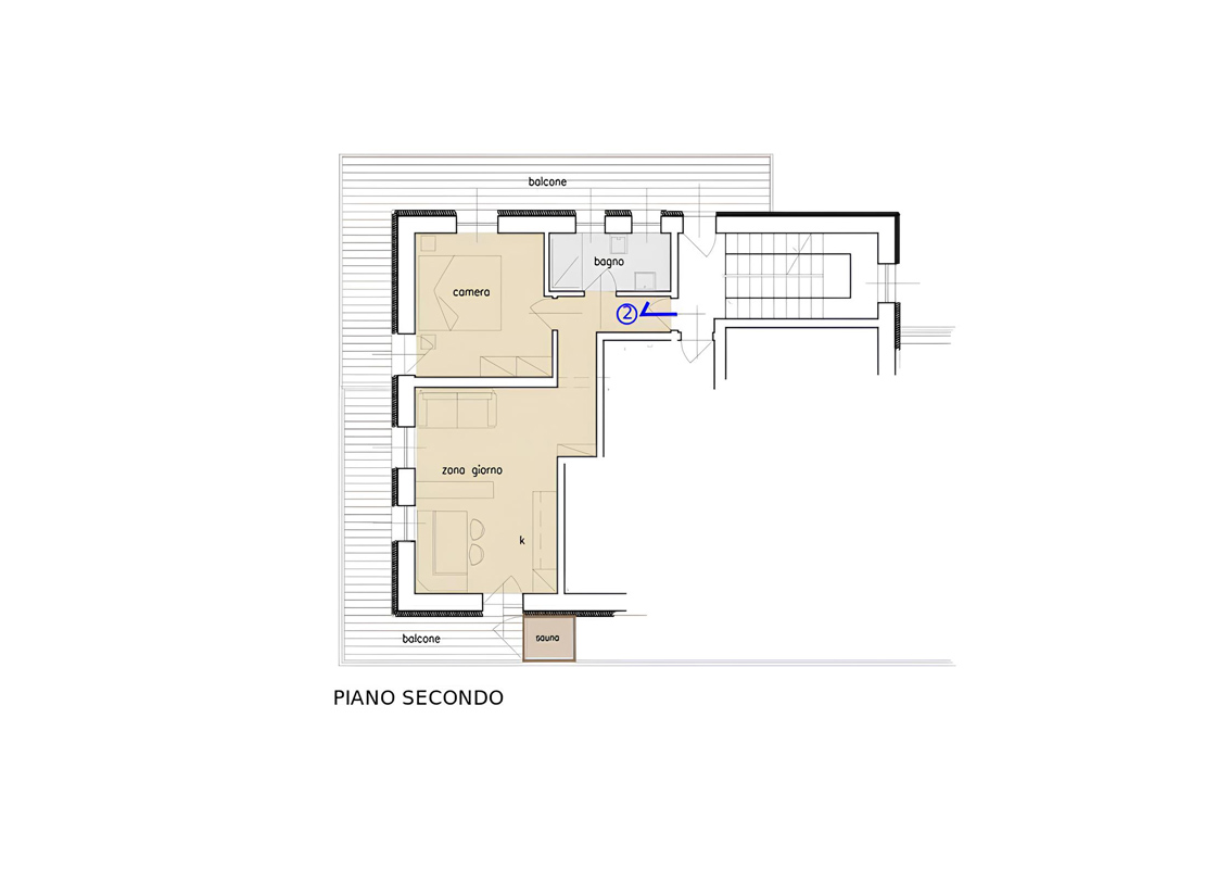 41 m² - 2 ložnice s manželskou postelí či 2 samostatnými lůžky, obývací pokoj s kuchyňským koutem a rozkládacím gaučem pro 2 osoby, sociální zařízení se sprchou, balkon s privátní bio saunou; apartmán se nachází v podkroví
