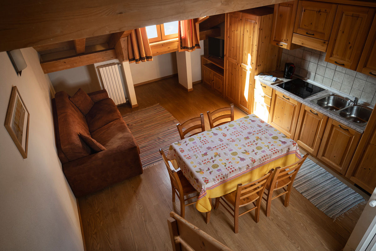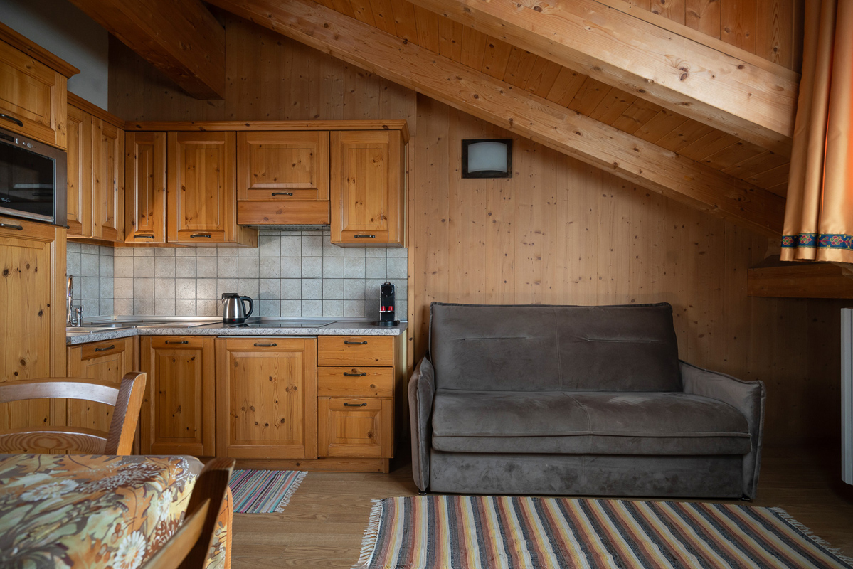 31 m² - obývací pokoj s kuchyňským koutem, rozkládacím gaučem pro 2 osoby a skříňovou palandou, sociální zařízení zpravidla se sprchou; apartmán se nachází ve podkroví a je bez balkonu
