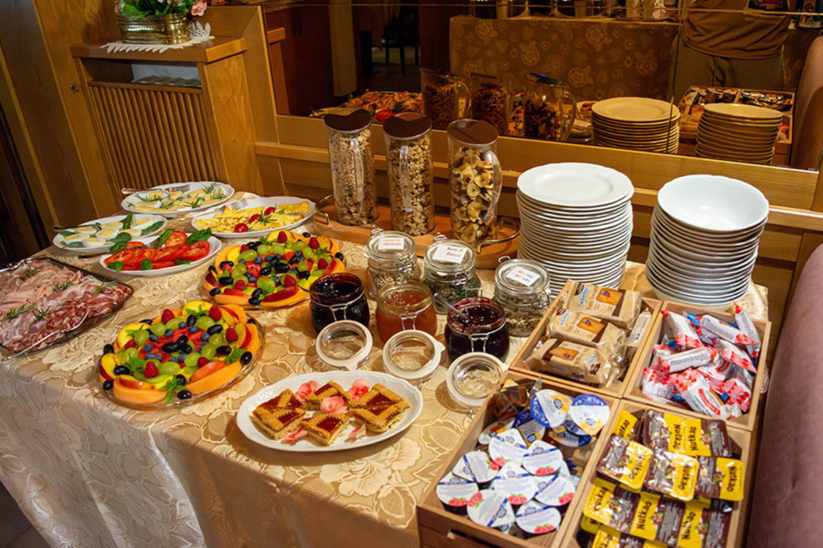 večeře - servírované menu s výběrem ze 2-3 teplých předkrmů a 2-3 hlavních jídel s přílohou, salátový bufet, dezert či ovoce, voda, ostatní nápoje za poplatek