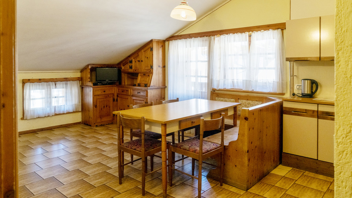 1 ložnice s manželskou postelí či 2 samostatnými lůžky, 1 ložnice se 2 samostatnými lůžky, obývací pokoj s kuchyňským koutem a rozkládacím gaučem pro 2 osoby, sociální zařízení se sprchou, balkon; apartmán je situován v podkroví