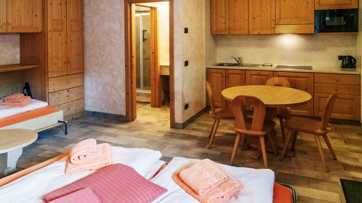 1 ložnice s manželskou postelí nebo 2 samostatnými lůžky, obývací pokoj s kuchyňským koutem a rozkládacím gaučem pro 2 osoby, sociální zařízení se sprchou; apartmán se nachází v přízemí se samostatným vchodem