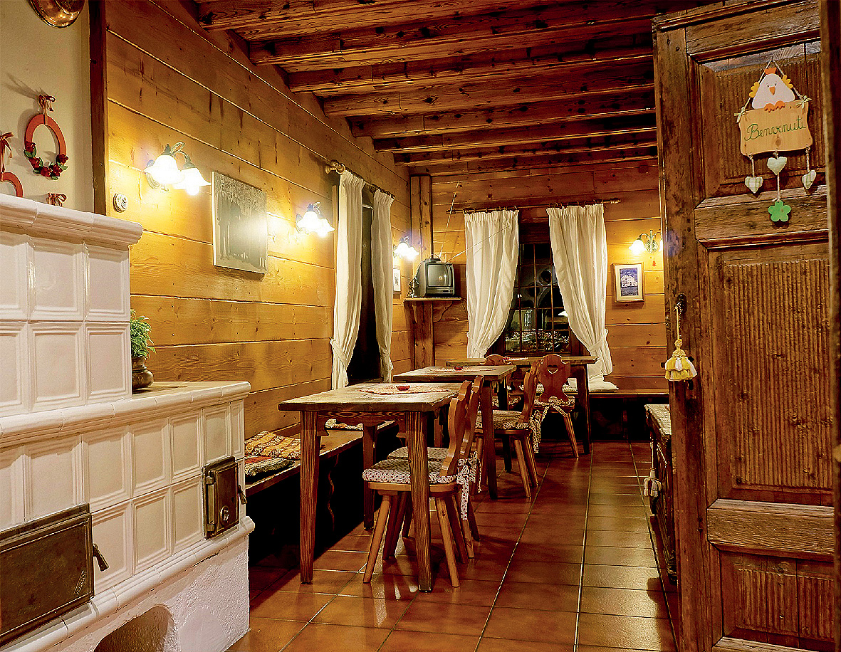 recepce / lobby, restaurace, typická horská společenská místnost s kachlovými kamny na dřevo, bar, společenská místnost s TV a dětským koutkem, wi-fi připojení k internetu, úschovna lyží a lyžařských bot, výtah, vyhrazená parkovací stání