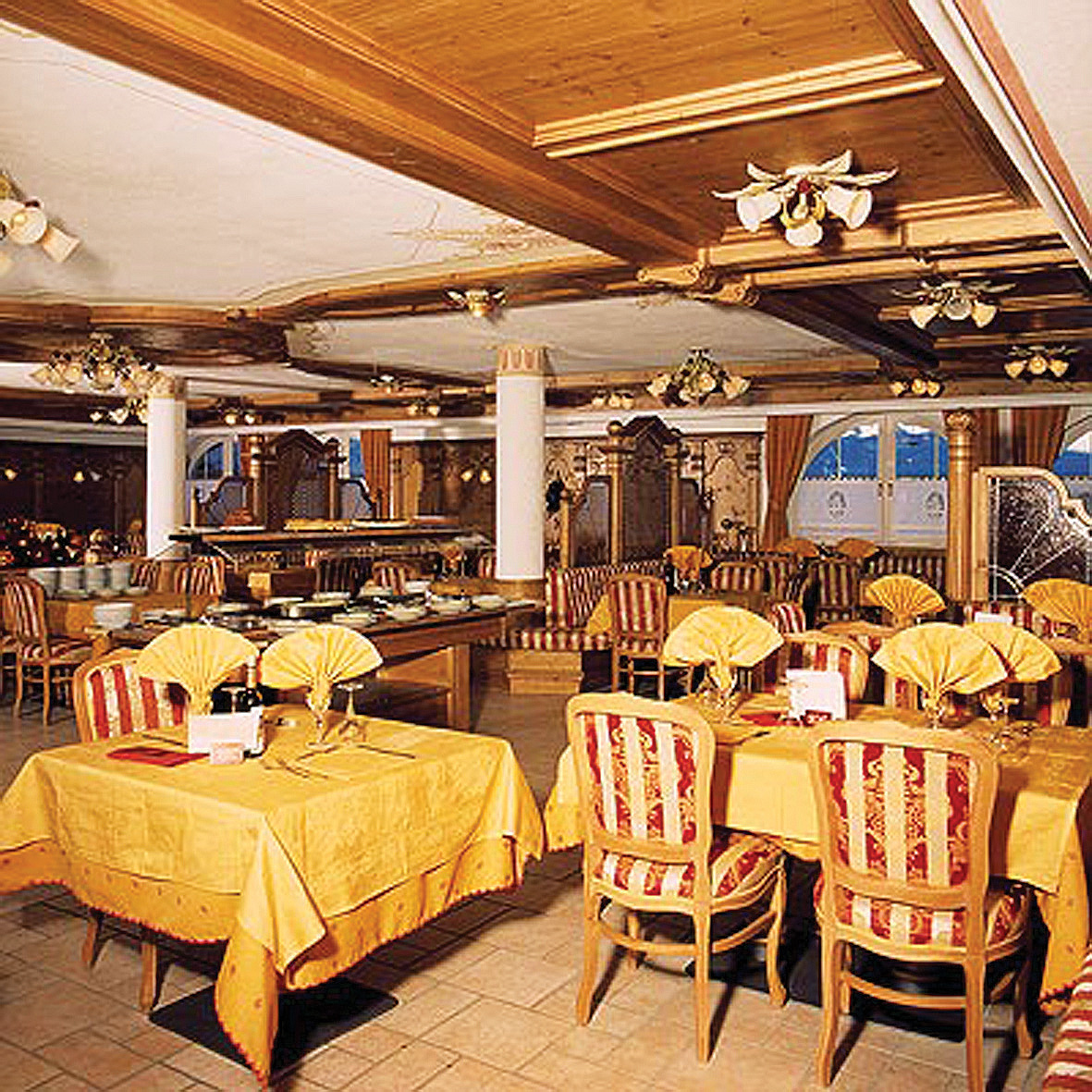 večeře - servírované menu s výběrem ze 3 teplých předkrmů a 3 hlavních jídel s přílohou, bohatý salátový bufet, dezerty a ovoce formou bufetu, zpravidla bufet porcované pizzy, nápoje za poplatek; 1x týdně typická večeře při svíčkách