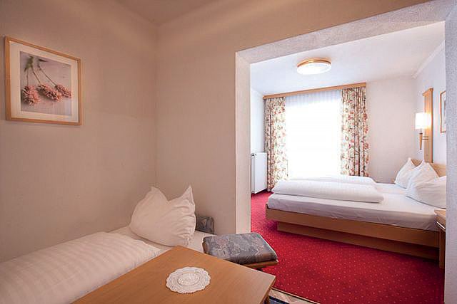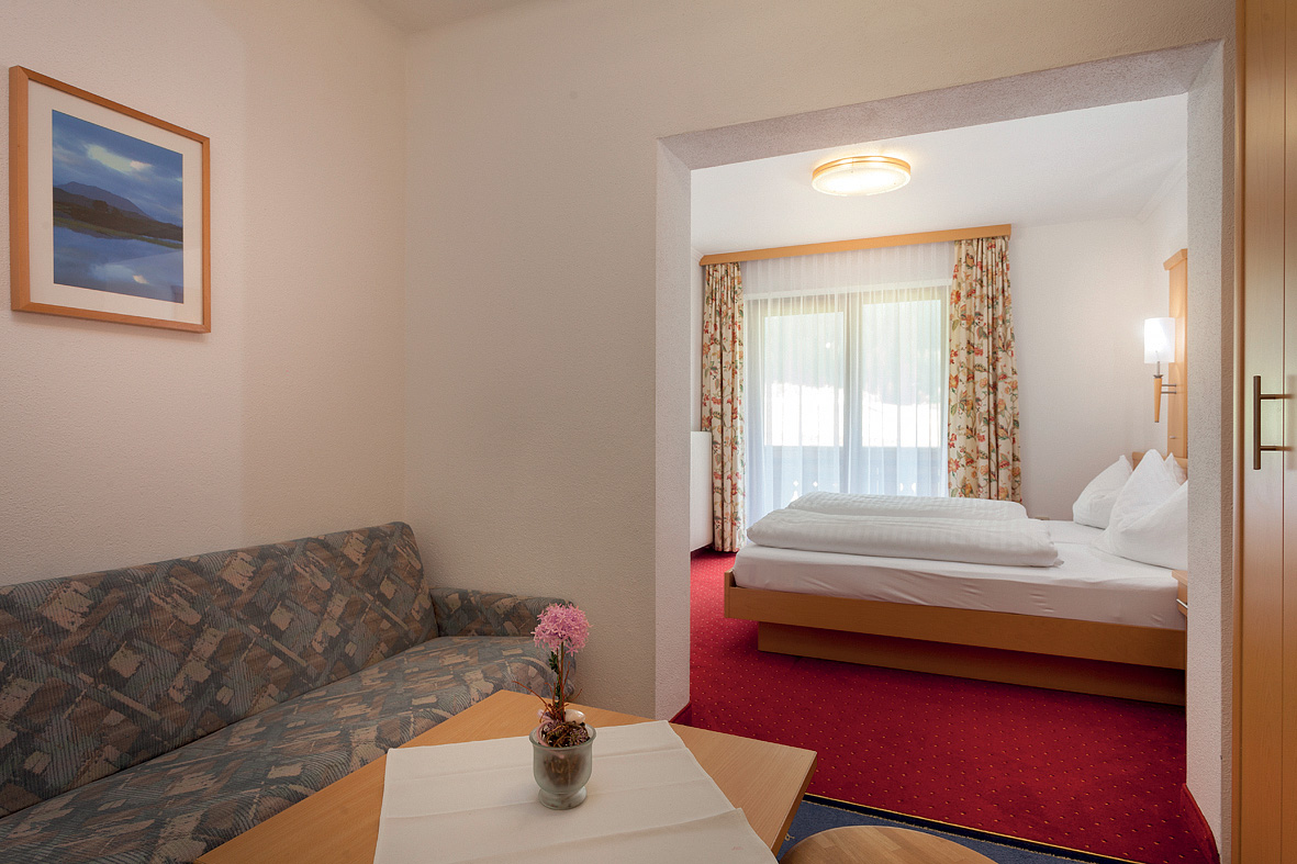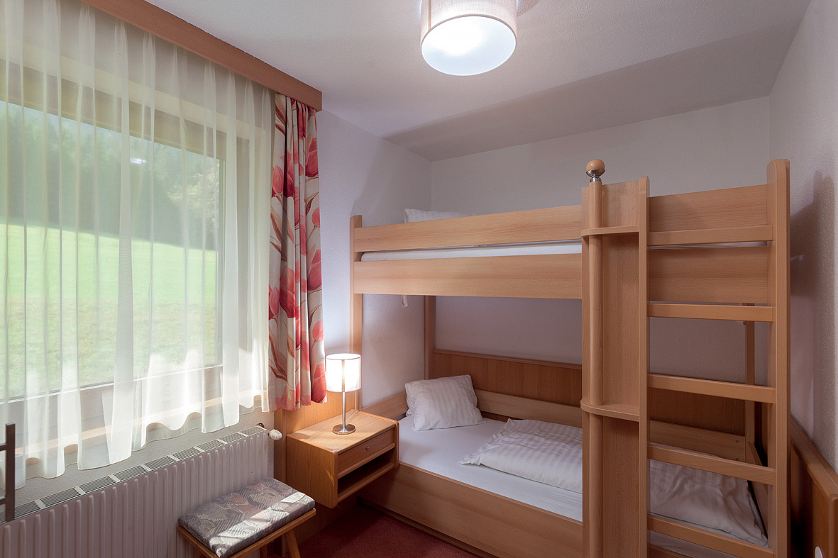 ložnice s manželskou postelí, ložnice s mimoúrovňovou palandou, obývací pokoj s rozkládacím gaučem pro 2 osoby, sociální zařízení, balkon; minimální obsazení pokoje 3 dosp. osoby, maximální obsazení pokoje 4 dosp. osoby a 2 děti do nedovršených 15 let