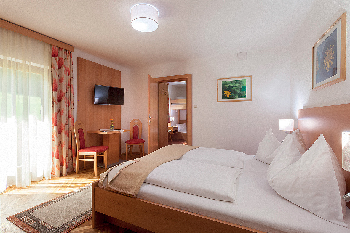 pokoj s manželskou postelí a případně rozkládacím gaučem pro 1 osobu (3. osoba možná pouze na vyžádání), sociální zařízení, zpravidla balkon