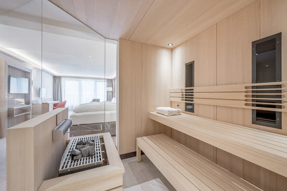 SPA Suite 3 sauna - 50 m² ložnice s manželskou postelí a rozkládacím gaučem pro 1 osobu, sociální zařízení s privátní saunou, oddělené WC, balkon