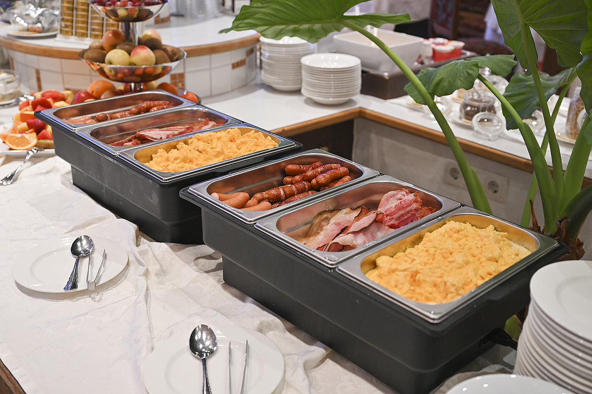 zpravidla servírované 5chodové menu s výběrem ze 3 hlavních jídel s přílohou, předkrmy a dezerty servírované či formou bufetu, salátový bufet; nápoje za poplatek