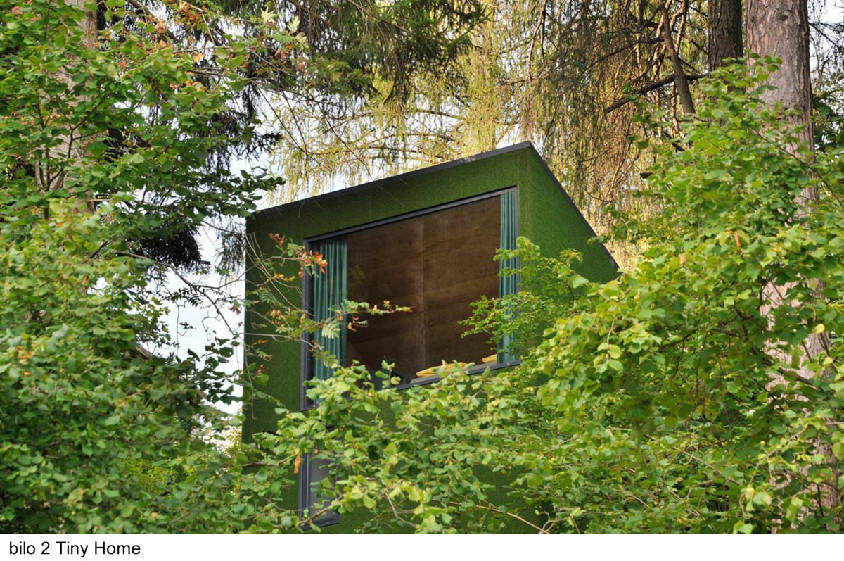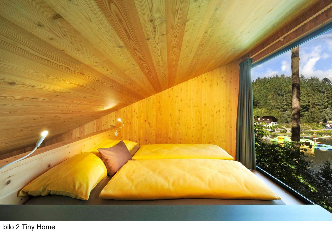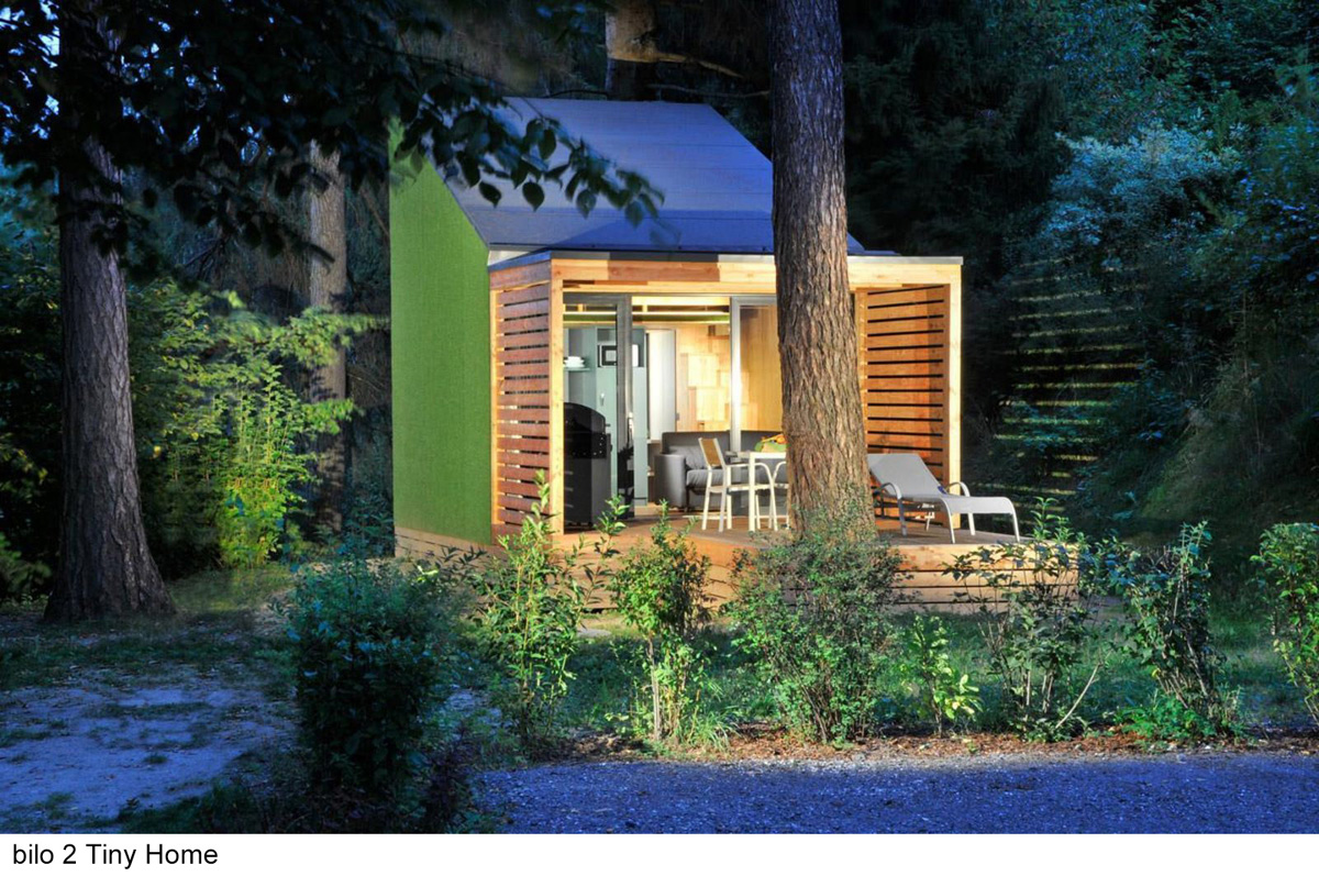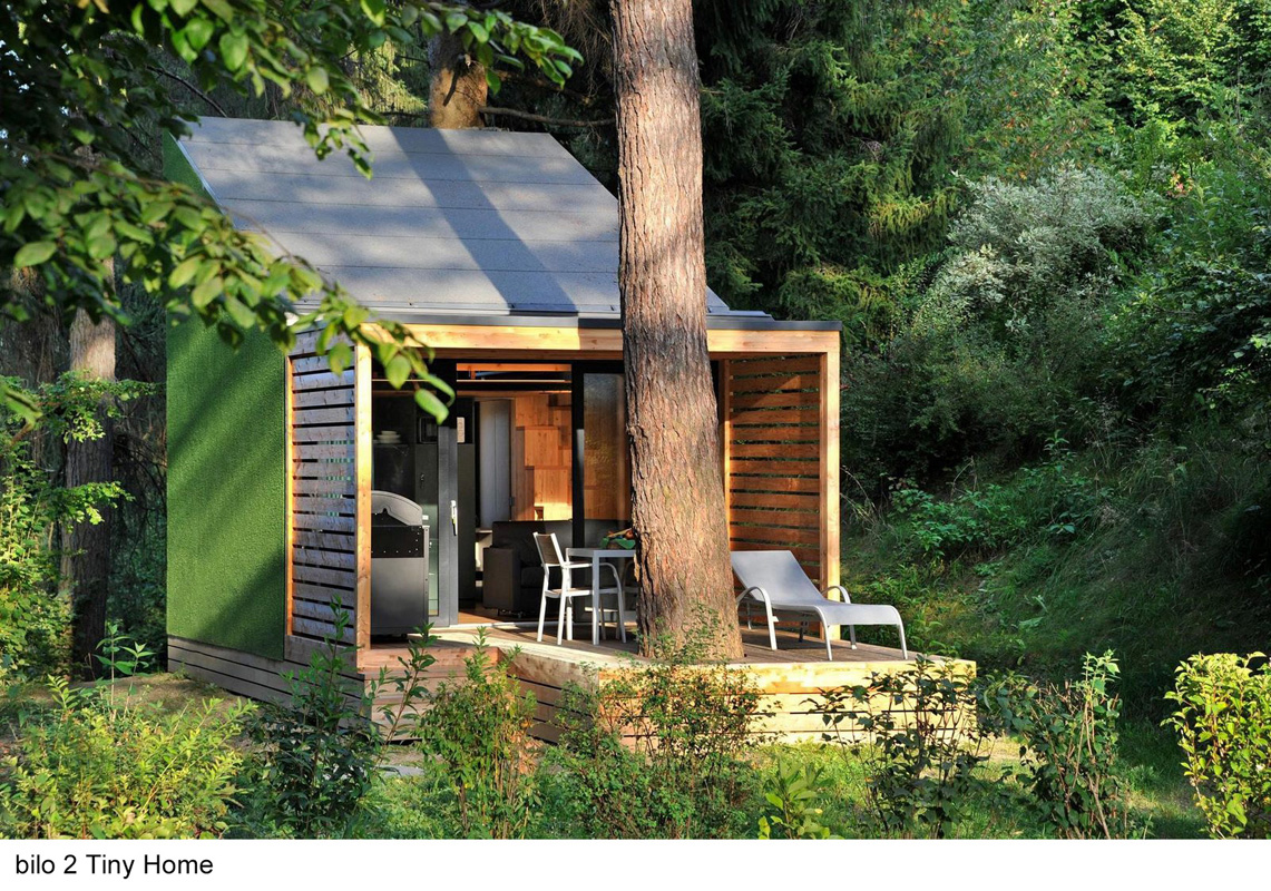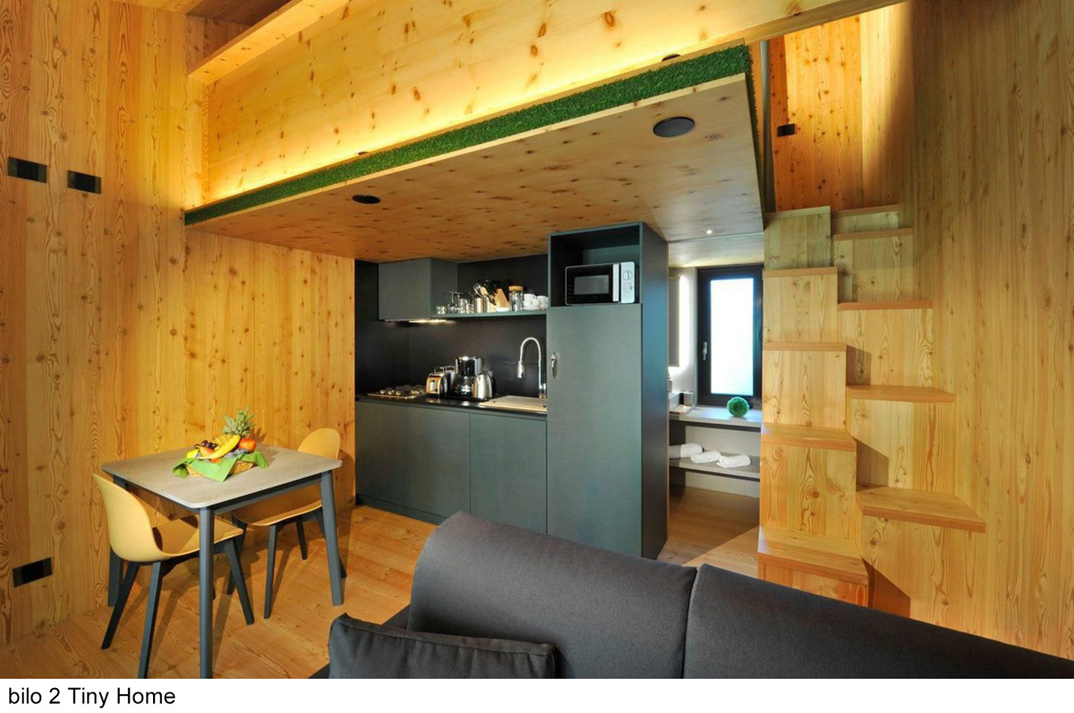 bilo 2 Tiny Home - 30 m² - ložnice s manželskou postelí na neuzavřeném patře, obývací pokoj s kuchyňským koutem a gaučem, sociální zařízení, terasa, privátní parkovací stání (1 místo / apartmán)