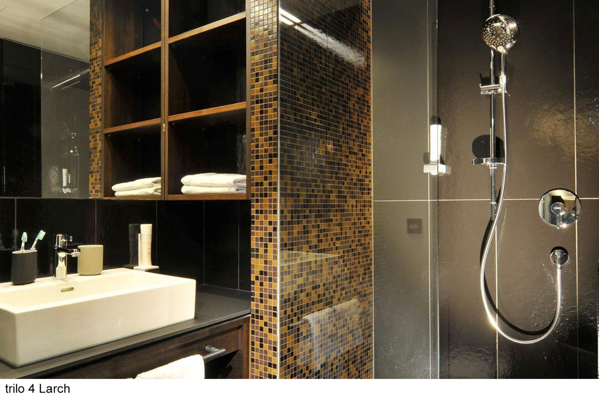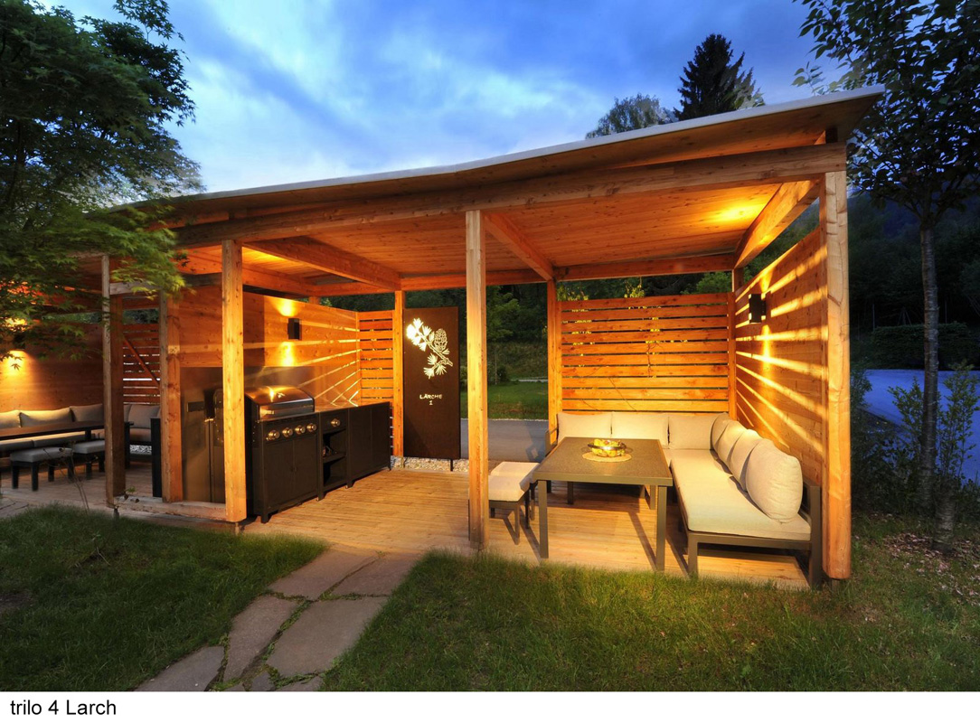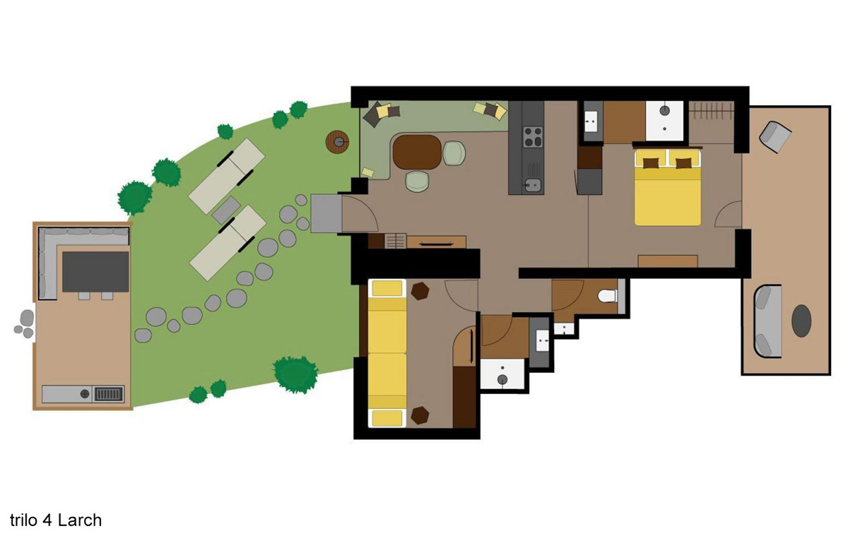 trilo 4 Larch - 57 m² - 1 ložnice s manželskou postelí, ložnice se 2 samostatnými lůžky či palandou, obývací pokoj s gaučem a kuchyňským koutem, 2x sociální zařízení, 1x oddělené WC, terasa s předzahrádkou, privátní parkovací stání (1 místo / apartmán)