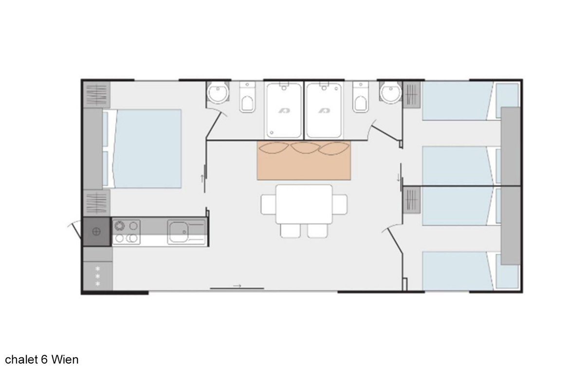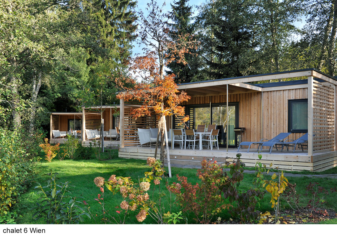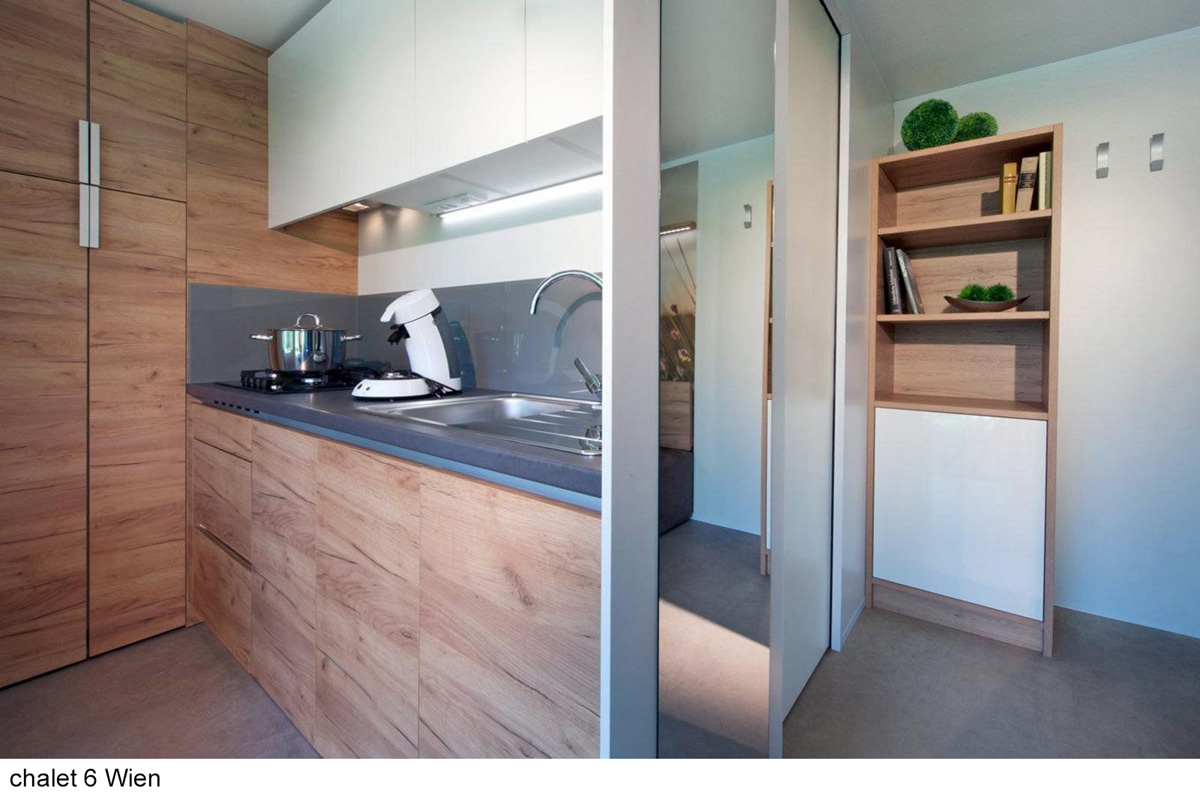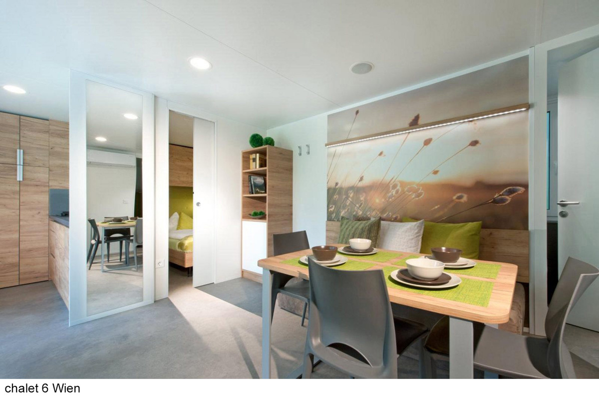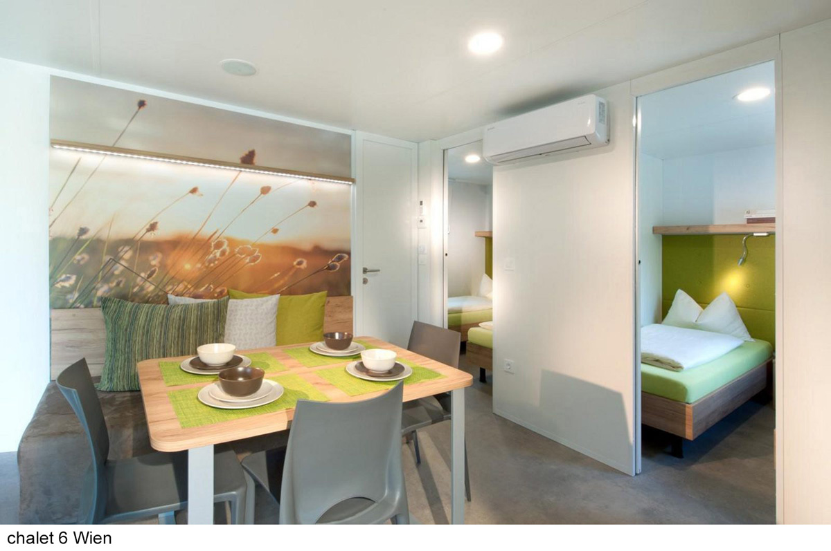 chalet 6 Wien - 40 m² - 1 ložnice s manželskou postelí, 2 ložnice se 2 samostatnými lůžky každá, obývací pokoj s gaučem a kuchyňským koutem, 2x sociální zařízení, terasa, privátní parkovací stání (1 místo / apartmán)
