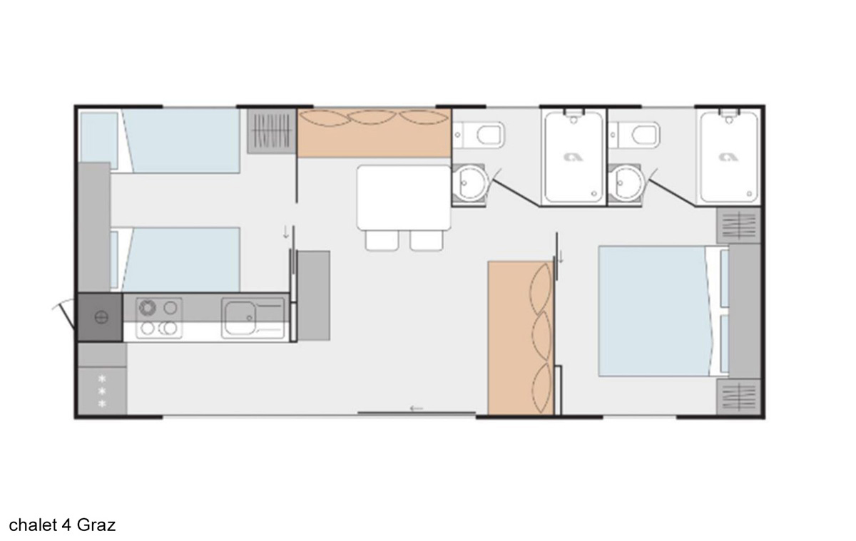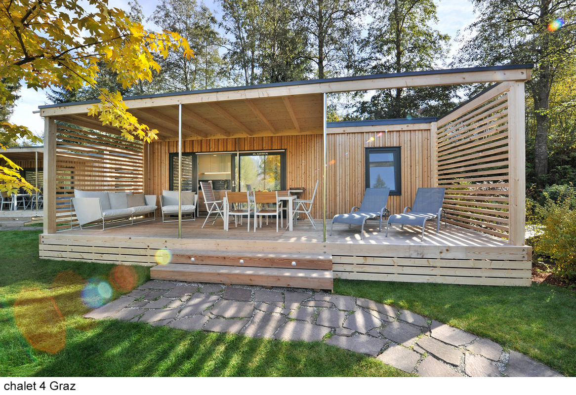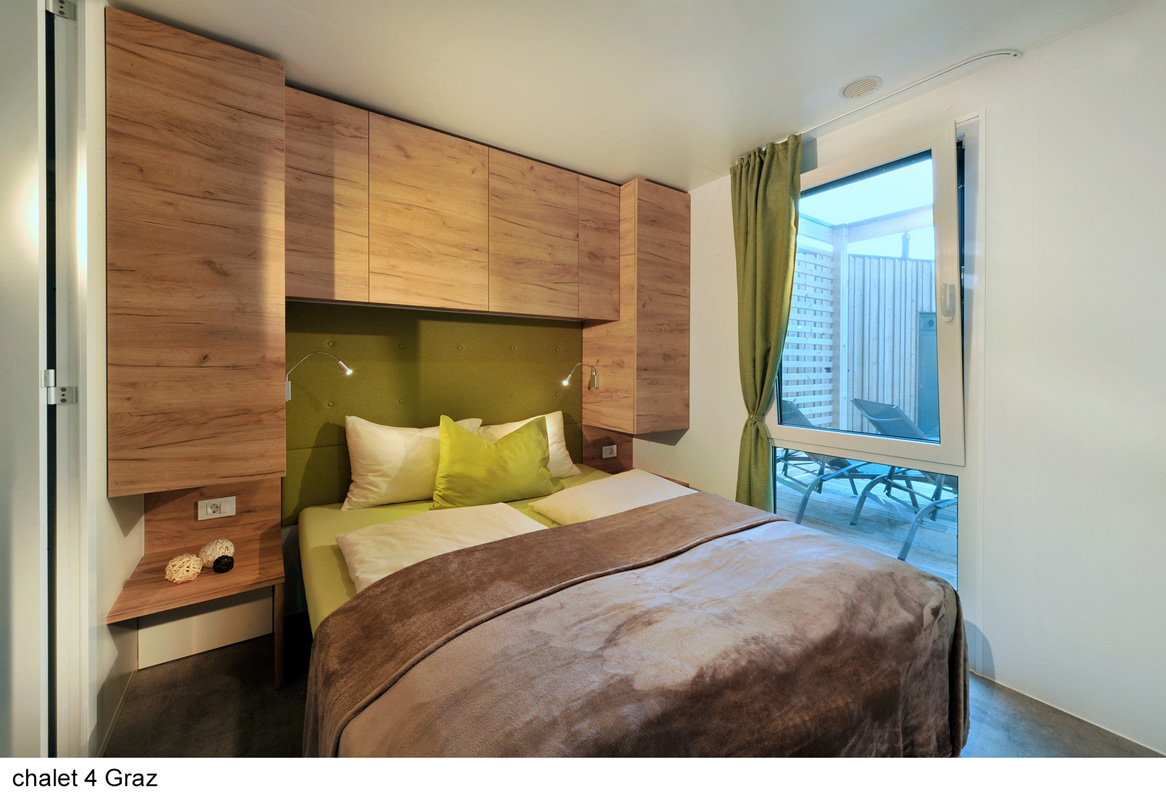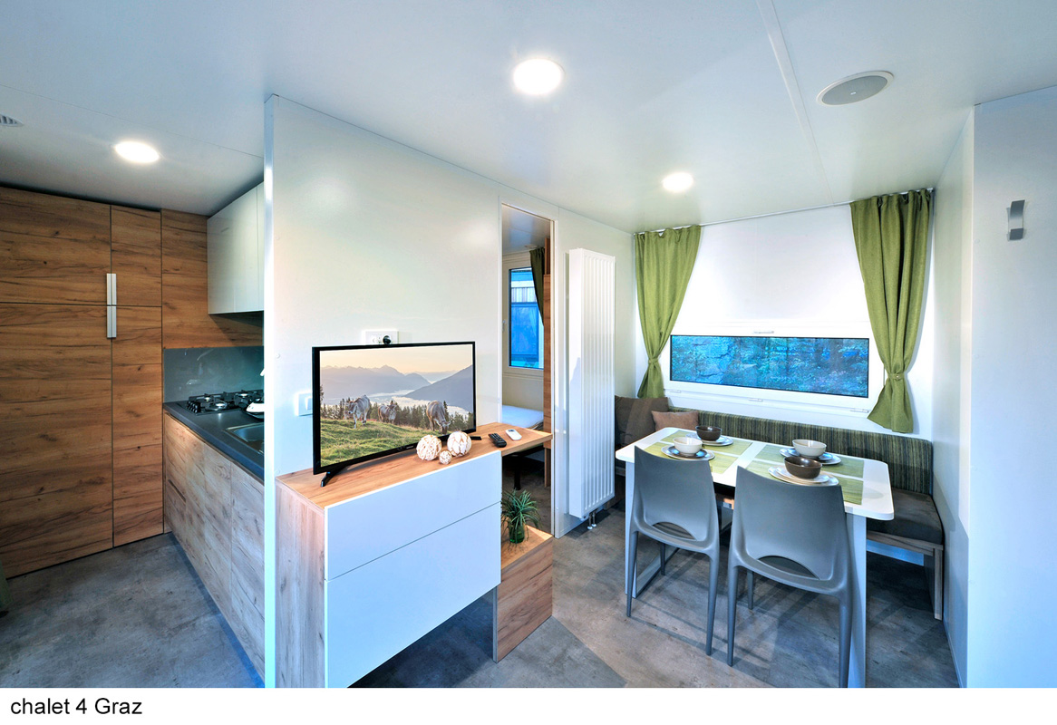 chalet 4 Graz - 34 m² - 1 ložnice s manželskou postelí, menší ložnice se 2 samostatnými lůžky, obývací pokoj s gaučem a kuchyňským koutem, 2x sociální zařízení, terasa, privátní parkovací stání (1 místo / apartmán)