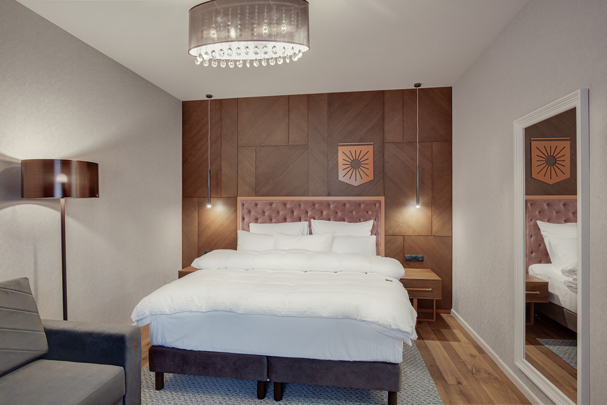 25-28 m² – pokoj s manželskou postelí či 2 samostatnými lůžky, rozkládacím gaučem formou přistýlky pro 2 osoby, sociální zařízení se sprchou či vanou, některé pokoje s balkonem