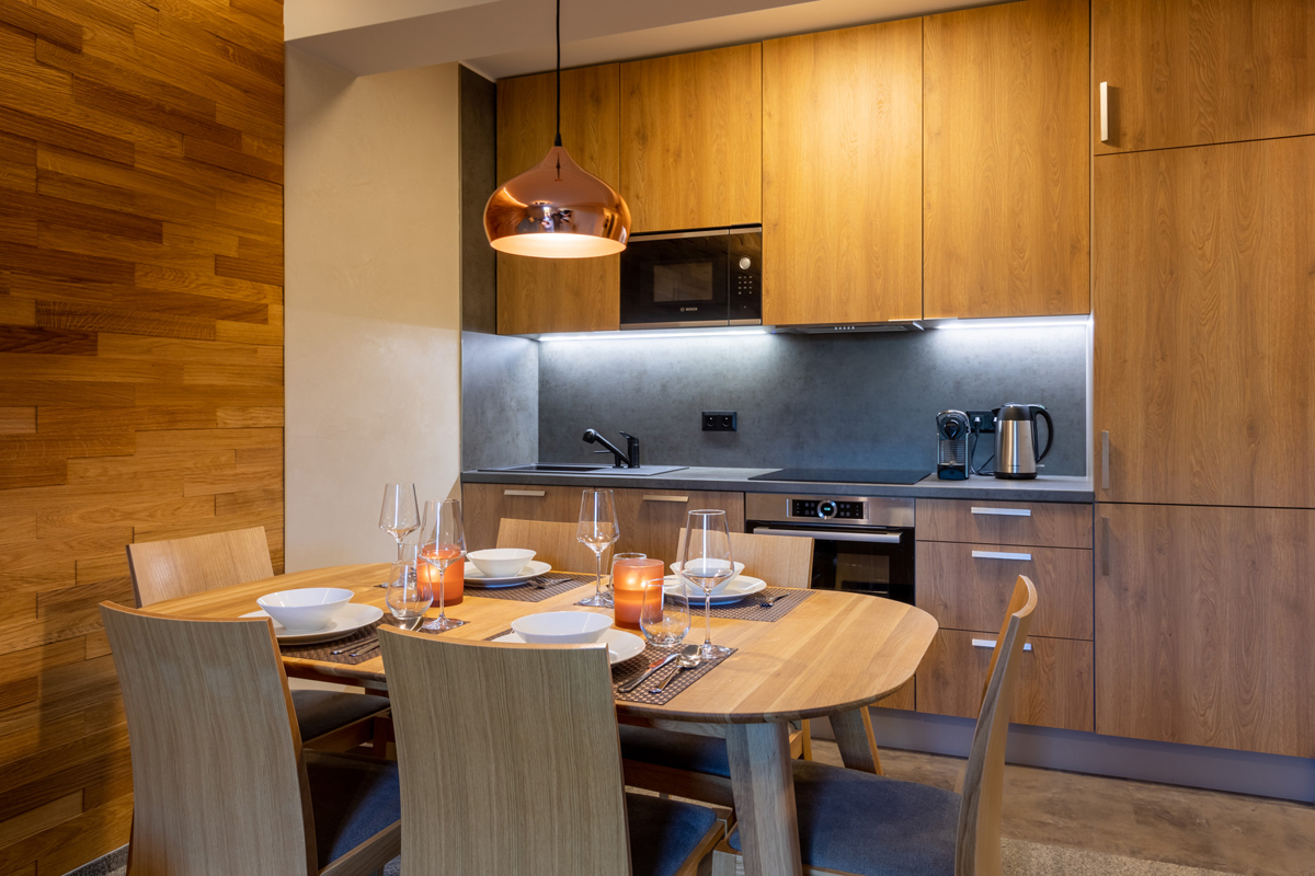 Suite Deluxe 2/3/4 - 52 až 63 m² - ložnice s manželskou postelí, obývací pokoj s rozkládacím gaučem pro 2 osoby, kuchyně, jídelní kout, sociální zařízení se sprchou, některé apartmány s balkonem