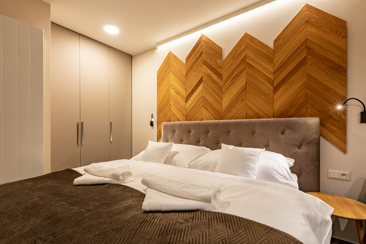 Suite Deluxe 4/5/6 - 67 až 78 m² - dvě ložnice s manželskou postelí či dvěma samostatnými lůžky, obývací pokoj s rozkládacím gaučem pro 2 osoby, kuchyně, jídelní kout, sociální zařízení se sprchou, některé apartmány s balkonem