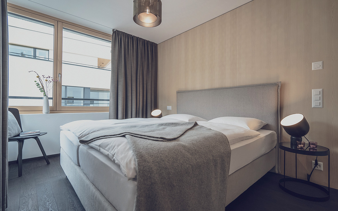 2 ložnice s manželskou postelí, obývací pokoj s kuchyňským koutem a rozkládacím gaučem pro 2 osoby, 2x sociální zařízení, balkon